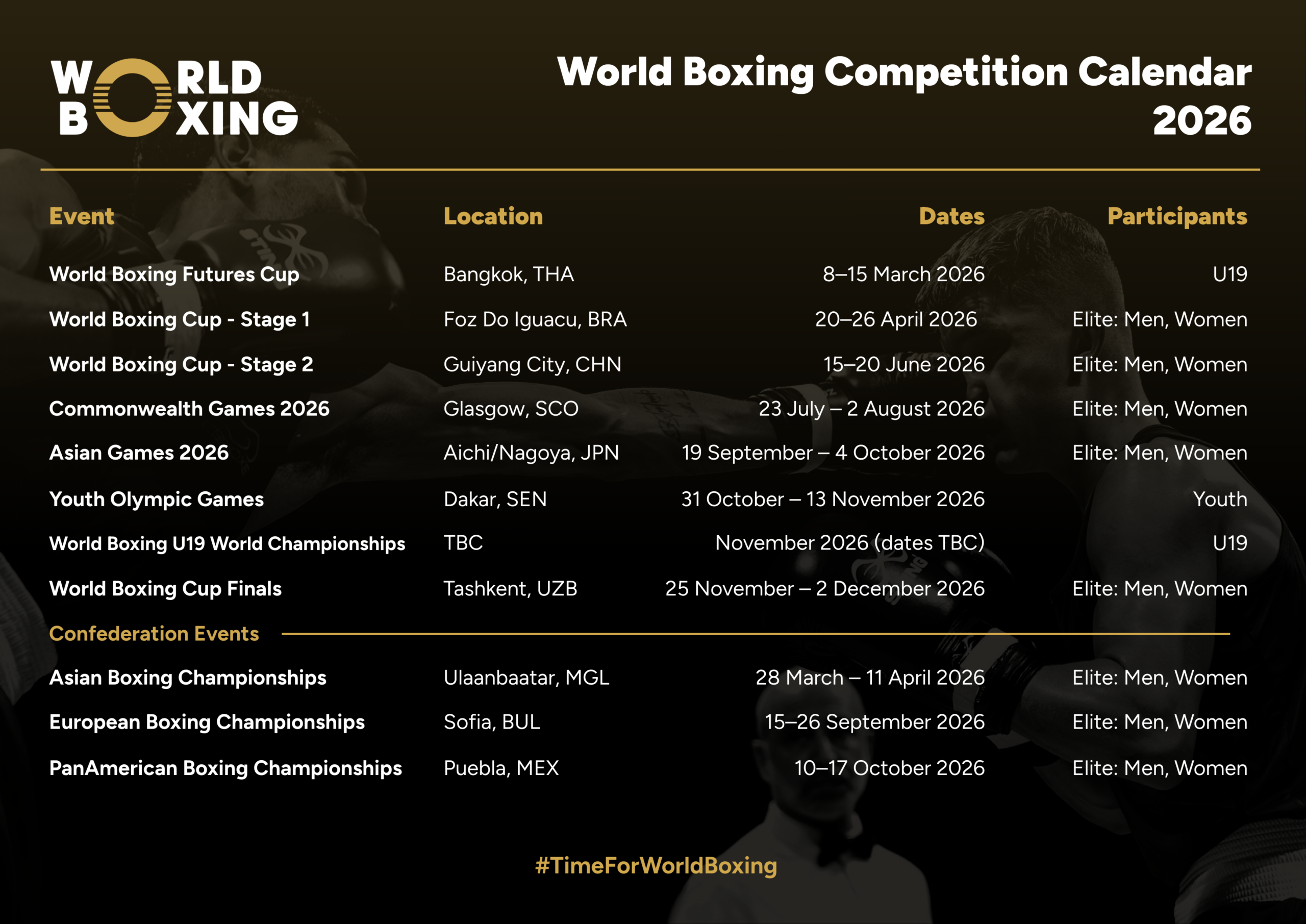Hier finden Sie die aktuellen Termine der World Boxing (Competition Calendar) 2026 >>